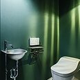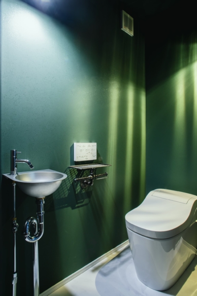 落ち着いたモスグリーンのクロスで、全体的にシックにまとめたトイレ。洗面ボウルはステンレスでかっこいい空間に。