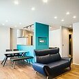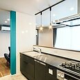 ブラックウォールナットの床とブラックの対面キッチンを基調に、キッチン周りのターコイズブルーがアクセントになったLDK。