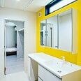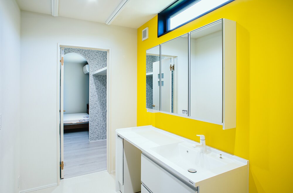 リビングとは対照的に、洗面室は鮮やかなイエロー。色使いで遊び心がみられ、素敵な仕上がりに。