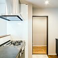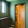 玄関ドアのキャメルブラウンが、グリーンのクロスに映えています。