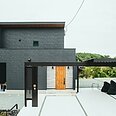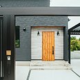 ブラックの外壁に玄関ドアの明るい色がアクセントとなり、洗練された印象に。